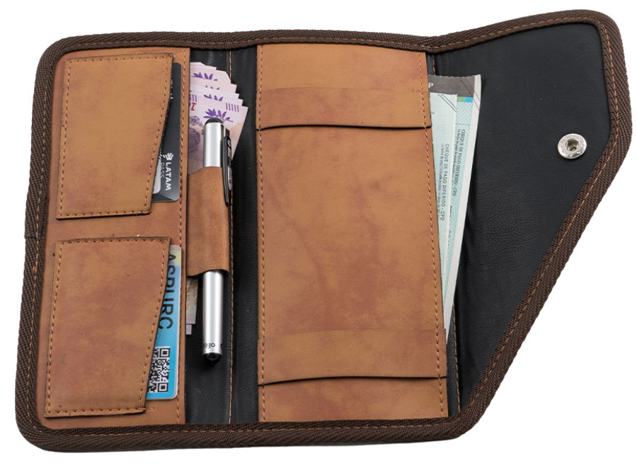 Porta documentos tipo sobre, fabricado en ecocuero, varias divisiones, cierre con broche imantado, personalizado con el logo de su empresa grabado a láser