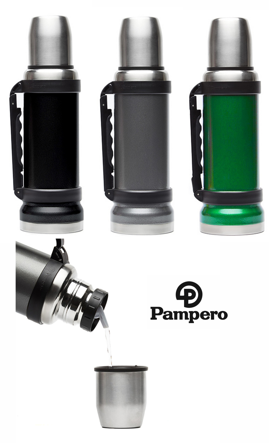 Termo Iguazu de Pampero: fabricado en acero inoxidable, recubierto con esmalte especial que protege de ralladuras y golpes. Puede mantener el contenido a la misma temperatura durante 18hs gracias a su doble pared aislante especial de acero. La capacidad es de 1,1 litros y cuenta con un tapón cebador hermético a rosca con la función anti derrame, tapa con superficie plana estable para usar como taza o vaso. Manija plegable para facilitar el transporte. Producto aprobado por el I.N.A.L. para el contacto con alimentos. Personalizado con el logo de su empresa grabado a láser
